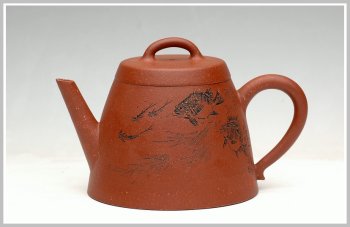 优质降坡泥,色泽变化丰富,养欲迷人,此款为石瓢变形中最受欢迎的一款,直流,高三角造型较为硬朗,桥钮和耳把柔润,所谓刚中带柔,出断水漂亮,一面刻绘鱼乐图,另外一面甲骨文装饰:月下游鱼乐自知。