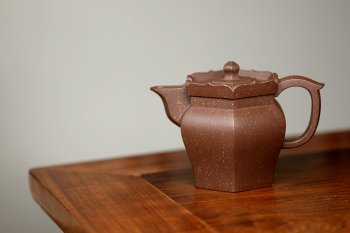 由于僧帽壶的壶身为等边等面折腰六方形,所以在泥片的对角连接工艺过程中需要扎实深厚的陶艺基本功和渊博的文化内涵。袁国强制作的僧帽壶把形、质、神发挥得淋漓尽致。“紫砂矮僧帽壶”轮廓清晰、锋芒内敛,各个部分的衔接自然贴切、和谐挺刮,造型上节奏紧凑、浑然一体。壶嘴与壶身的连接处、壶颈的肩线线条等细节处都显现出手工艺的趣味和紫砂传统造型艺术的精神。
