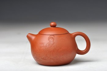 西施造型多变,此款略扁,造型圆润可人,流嘴微翘,显得尤为可爱,倒把流畅优美,壶钮略显扁圆,与壶身相应和,口盖较大,集实用与娇美与一体。整体看来,此全手西施,制作精细,比例协调,将西施的柔美诠释的非常到位。更有谭华斌老师精心装饰西施浣纱,人物线条细腻流畅,表情逼真,实乃精品!