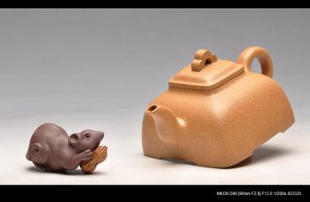 孤菱和传炉都要求线与面过度于无形,此壶方圆之结合甚妙,把和流做的很圆,较为硬朗,俯视呈四方,但线条和块面缺不棱角分明,显得方中带圆,侧面看为覆斗状,但并非直棱角的覆斗,而是像两条斜边向外弯曲的混方梯形。盖和颈部是小四方,底部相对壶盖上部又大出很多,这样的上下变化全依靠自壶盖延伸下来的四条弧线的连贯与过度,身桶基本上呈现四方,把成圆。整把壶的各个部位搭配相得益彰,比例协调,显得制作精制