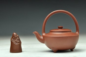 壶身为半月形,与提梁的虚空间相合成圆,提梁紧扣壶身,外扁平而内圆润,形体上以三足撑起打破整圆的沉闷,此三足也是相当耐品,敦厚可爱,空间与实体的变化恰倒好处,尤显朴实无华凝重端正。