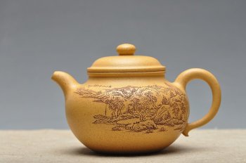 • 紫砂壶图片:古朴经典 儒雅得体 通景山水 莲子 - 宜兴紫砂壶网