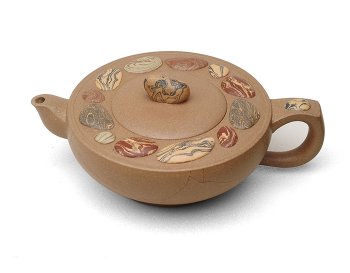 他善于总结前人经验,结合个人敏锐的感触另辟蹊径,拓展创作题材,并致力于泥料的研究与实验,发明砂壶绞泥装饰工艺。绞泥工艺,是指将多种色泥混在一起,捏搓、拍打成片制作砂壶。其困难在于容易因色泥烧成速度各不相同,导致砂壶产生裂痕,这考验作者对泥料、火候的认识与功力。绞泥装饰有着类似宋代钧窑窑变青瓷宛若生成、独一无二的特殊效果,色彩变化多端,纹路流畅自然。吕尧臣开创此种装饰技法的新河,为紫砂艺术更添光彩。