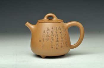 此壶为张听刚全手玩砂,高石瓢型,高挑玉立,然嘴把壶身壶钮均透露出敦厚可人之味,桥纽平盖,身桶上敛下丰,形成三角之型。壶身刻绘共三式,个个味道不同,颇有玩味,或生兰香,墨香,古风,自品其乐。。。