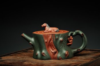 盖子和壶底均采用手工嵌段泥,设计新颖、造型独特、形态自然、生动、逼真。壶盖一匹马,壶身一只猴探出头来,寓意“马上封侯”。工艺讲究,做工细腻,线条清晰流畅,细节之处处理精妙,更体现手工壶之功力,手感舒适 出水流畅、气密性好,不散花、不挂水。