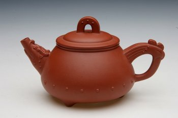 壶的主体是石瓢的基本形,根据"龙"、"凤"概念安接附件,壶体下部一 排鼓钉,使龙嘴、凤把、穹形钮之间的呼应关系显得生动起来。