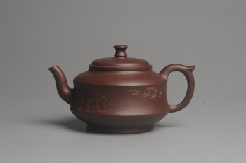 • 紫砂壶图片:美壶特惠 油润调砂紫泥精致扁石壶 雅刻山水 - 宜兴紫砂壶网