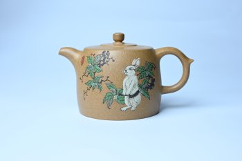 • 紫砂壶图片:美壶特惠 精致特好黄段泥井栏壶 泥绘祥瑞兔子 惠风和畅 寓意吉祥好运常来 - 宜兴紫砂壶网