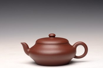 扁灯壶乃传统光素,邵春良老师采用传统全手工,上下刹凹,功力颇深。它敦厚稳重,小小的卵圆形壶钮犹如火头,充满着旺盛的生命力。瘦瘦的溜肩滑落下来,壶腹饱满自然,壶底收缩为柱形。从壶肩到壶腹、壶底的收缩伸张之间,似有无限的力量蕴集其中,跌宕起伏。