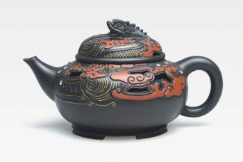 飞黄腾达壶采用多种装饰工艺精制而成,壶体结构采用双层镂空,24K黄金镶嵌成水浪,宝石水钻则是浪花,一条巨龙奔腾在红色的祥云里。该壶气势磅礴,端庄宏伟。 作品《飞黄腾达壶》获2003年第二届中国十大名壶奖,被江苏台办作为珍贵礼品赠送台湾亲民党主席宋楚瑜先生。