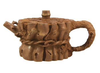 壶把状若虬屈的松枝,壶流有如横生的梅枝,盖纽又巧塑成一段竹节,更为绝妙的是,在树干小洞中,还塑有两只小松鼠。
