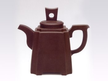 是从传统提梁合欢的造型意念得到启发,从两个半圆相合,变成两个长 方斗形相合。在造型上还吸收了青铜器"簠"的某些特点,壶腰线处理成"凸棱",底脚微微向外膨开,都可以看出 "簠"的形态痕迹。