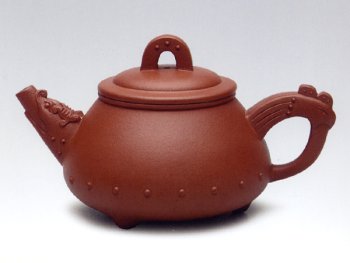 壶的主体是石瓢的基本形,根据"龙"、"凤"概念安接附件,壶体下部一 排鼓钉,使龙嘴、凤把、穹形钮之间的呼应关系显得生动起来。