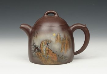 • 紫砂壶图片:泥绘老虎秦权壶 - 宜兴紫砂壶网