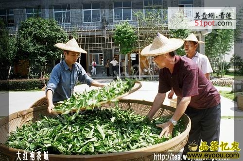 晒青程度以叶片半呈柔软,两侧下垂,失去固有的光泽,由深绿变成暗绿色,水分蒸发掉15%左右为适度。晒青原则“宁轻勿过”,这样才能在晾青中有利于恢复青叶一部分弹性,才有利于做青的进行。鲜叶除了用日光外,遇阴雨天还可采用加温萎凋方法