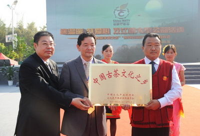 文化部文化产业促进会副会长王国基向双江县 人民政府授予了“中国古茶文化之乡”称号。王国基表示,双江县有着规模最大、绝无仅有的古茶群落和滇濮千年的制茶工艺与文化积淀,是世界少有的活的古茶基 因库。经过一年多的调研评估与意见征询,专家组决定授予双江县全球唯一的“中国古茶文化之乡”称号。